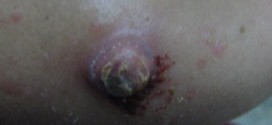 Un enfant de 13 ans consulte pour une plaque crouteuse de la pointe nasale.