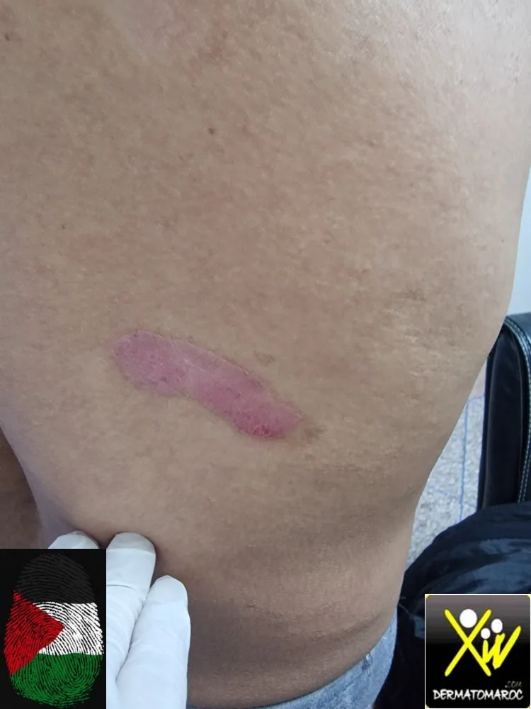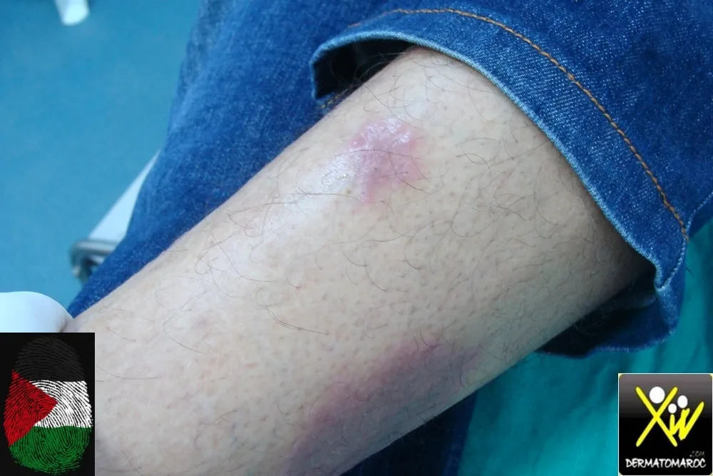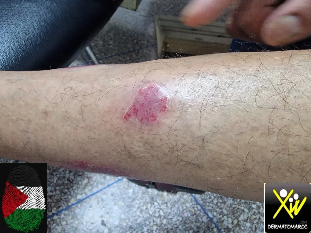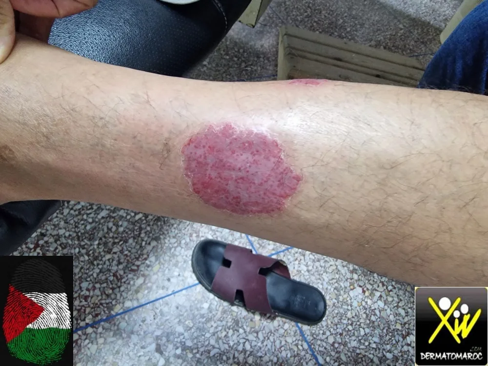 L ‘examen confirme la présence de lésions bien limitées, arrondies, suintantes, aux membres, au gland et au tronc.